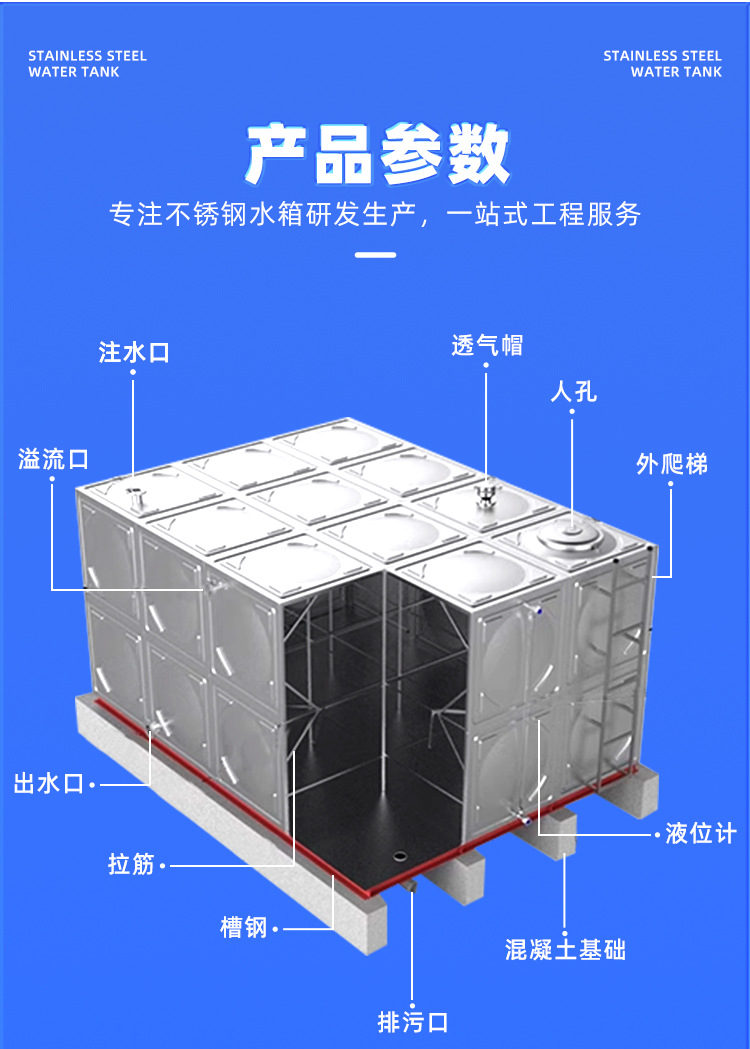 方形水箱設有檢修孔、進水口、出水口、排污口、排氣口、溢流口,有時根據(jù)客戶水箱的功能而增減水口。排污口是排放水箱內污垢的,可直接接排污閥門就地排污,可現(xiàn)場根據(jù)實際情況安裝。溢水口是水箱排氣和浮球閥失靈時溢水之用,可接在排污,亦可讓其就地排水,但切忌不能裝閥門。浮球閥應經常檢查,及時維修。